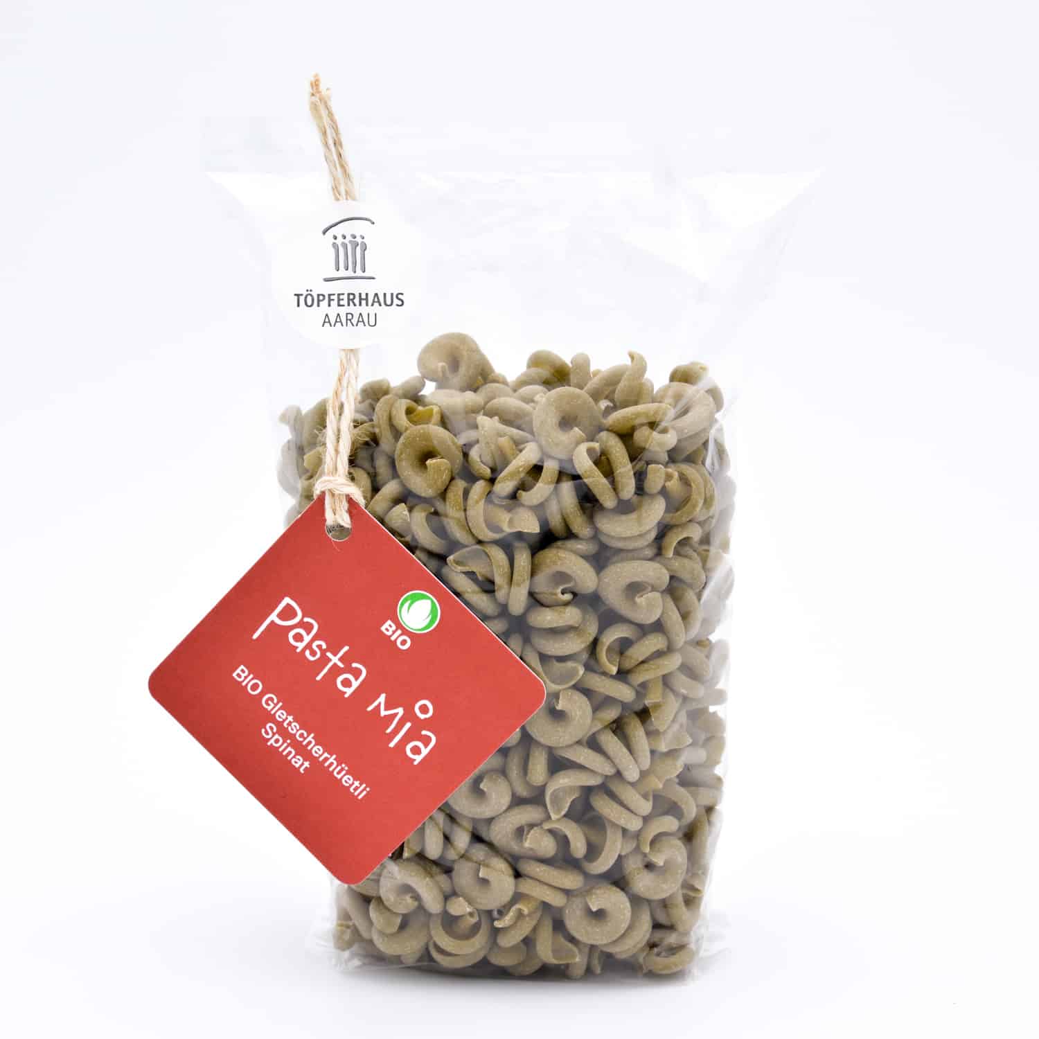 Die Bio Gletscherhüetli fertigen wir mit gemahlenem Spinat. Goldbraun gebratene Knoblauchscheibchen, Zwiebelringe, Pinienkerne und ein Klacks Crème fraîche machen diese Pasta zu einem Gaumen- und Augenschmaus.