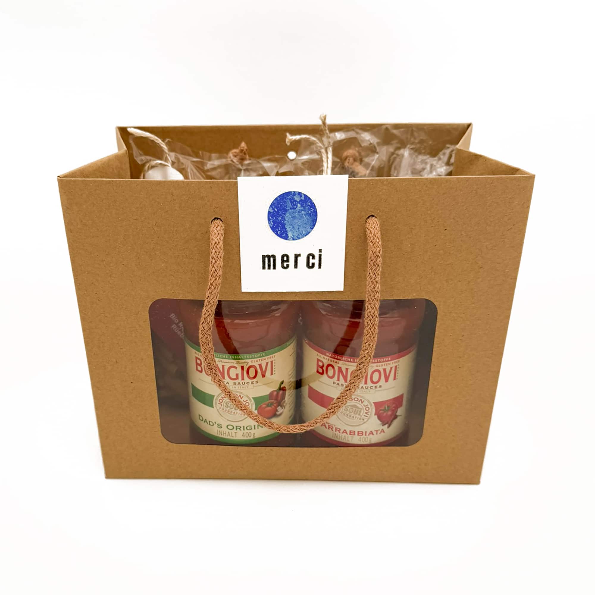 Geschenksäckli dekoriert mit Sichtfenster für 2 Teigwaren und 2 Pasta Saucen. ACHTUNG: Bei Postversand werden die Säckli nicht bestückt. Die Waren werden einzeln eingepackt, damit das Säckli nicht beschädigt wird.