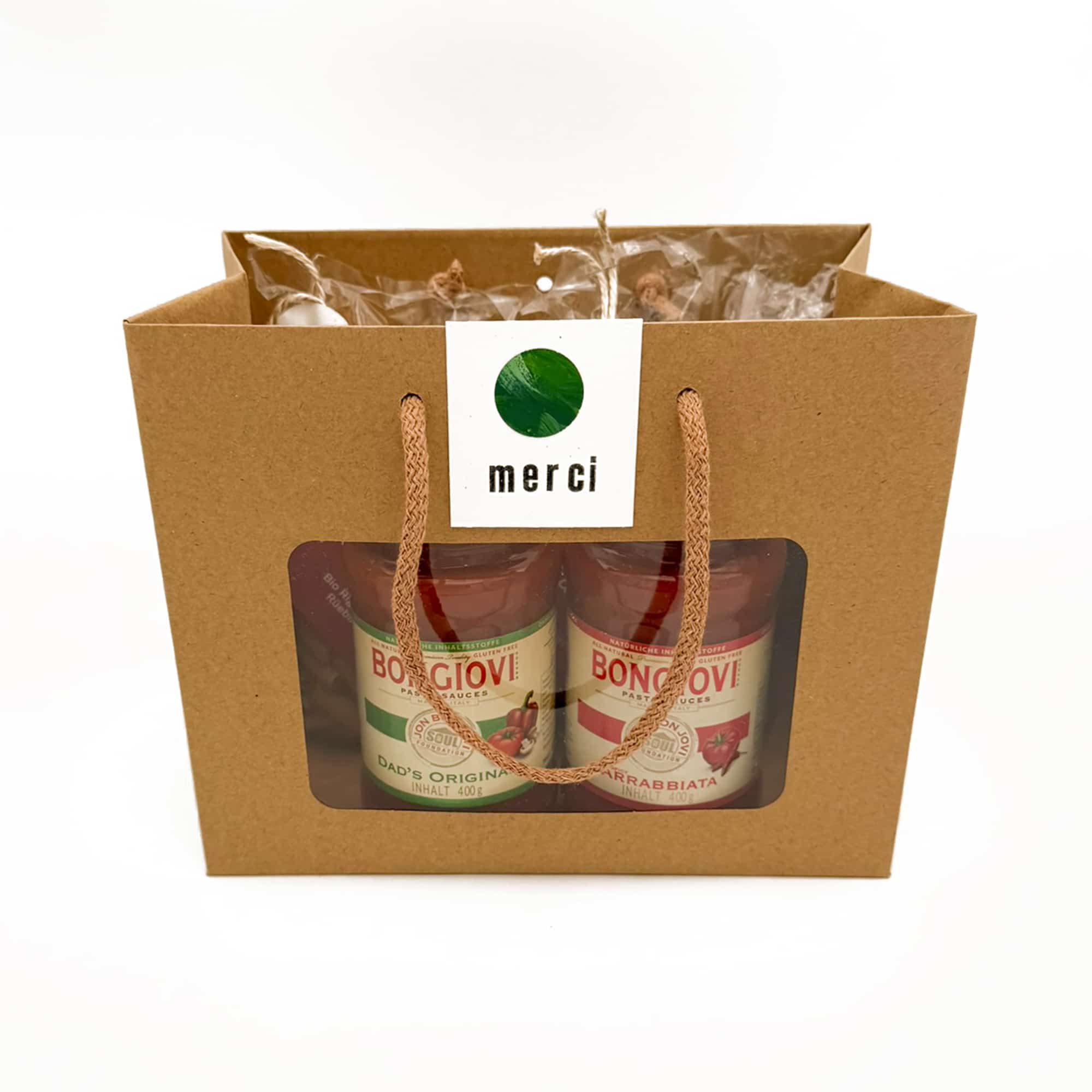 Verschenke Genuss aus der Tüte! Geschenksäckli dekoriert mit Sichtfenster für 2 Teigwaren und 2 Pasta Saucen.