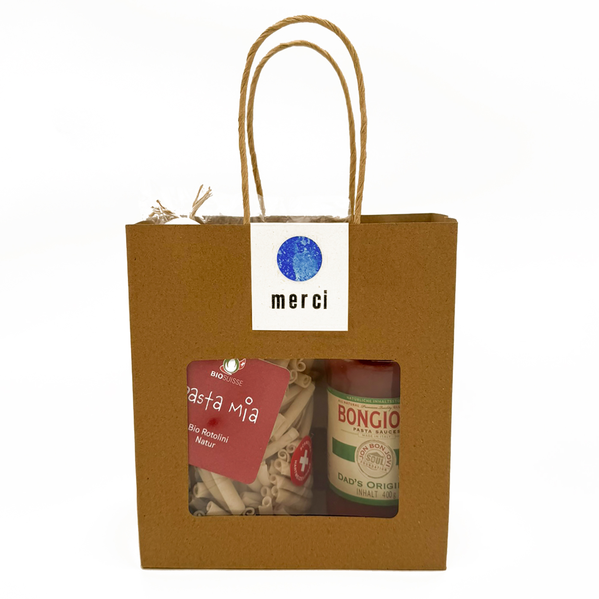 Eine kleine Tüte voller Genuss! Geschenksäckli dekoriert mit Sichtfenster für 1 Teigware und 1 Pasta Sauce.