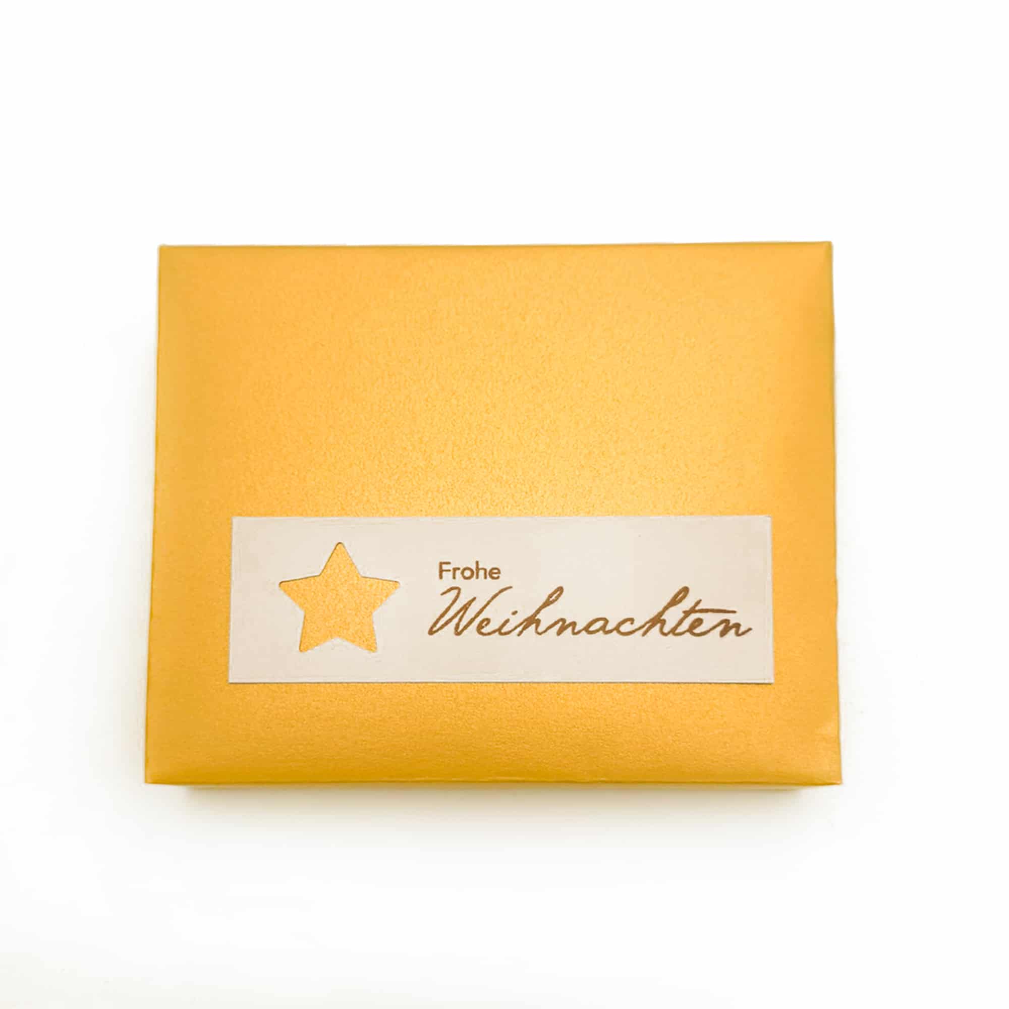 Das 9er-Goldstück-Pack in einer Goldhülle mit Schriftzug „Frohe Weihnachten“. Ein süsses Geschenk unter dem Weihnachtsbaum.