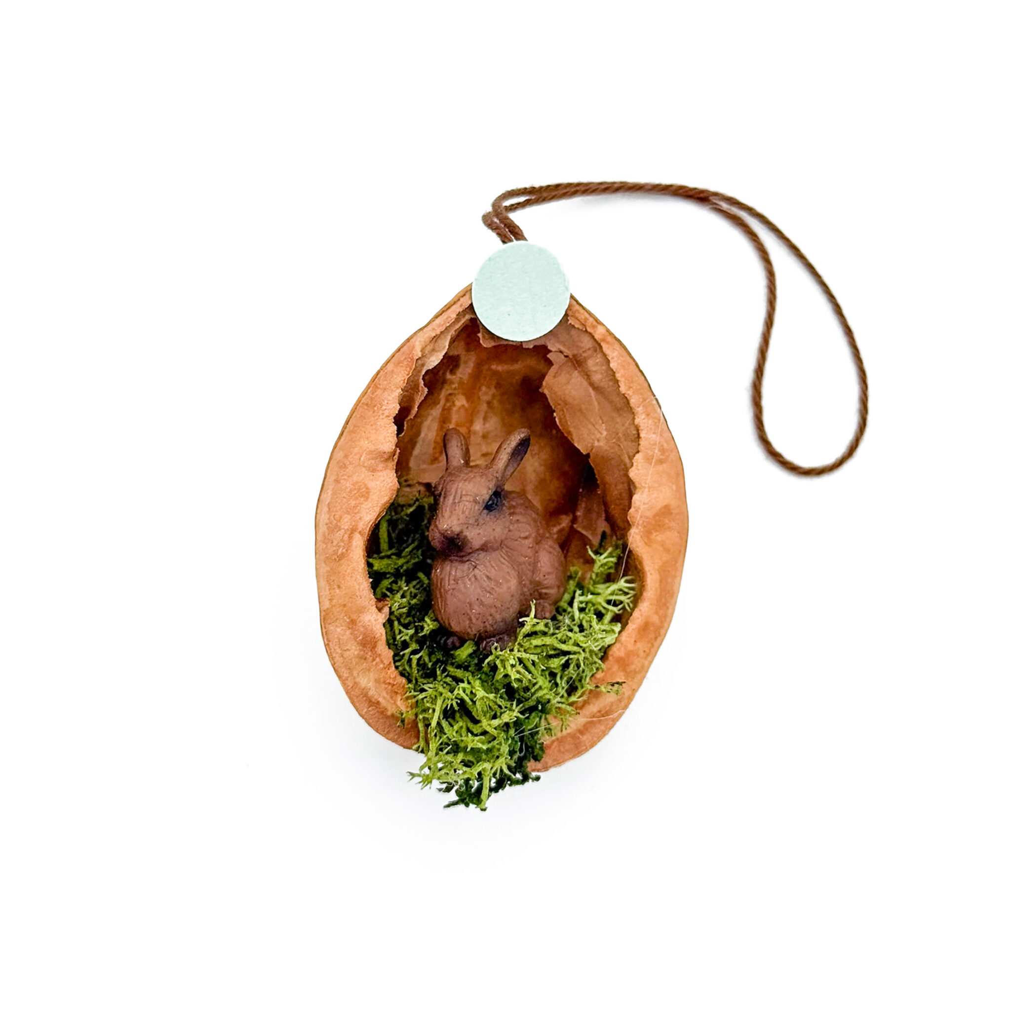 Nusshälfte mit Hase im Moos.