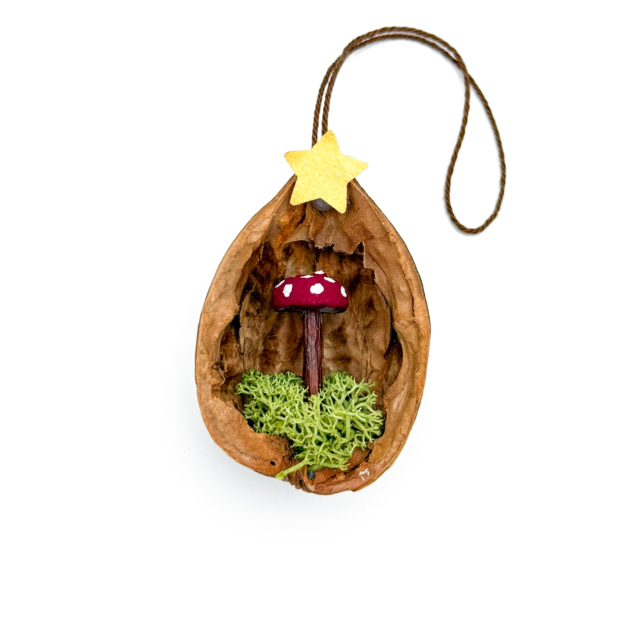| Zutaten | Nusshälfte mit handgefertigtem Pilzli auf Moos |