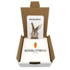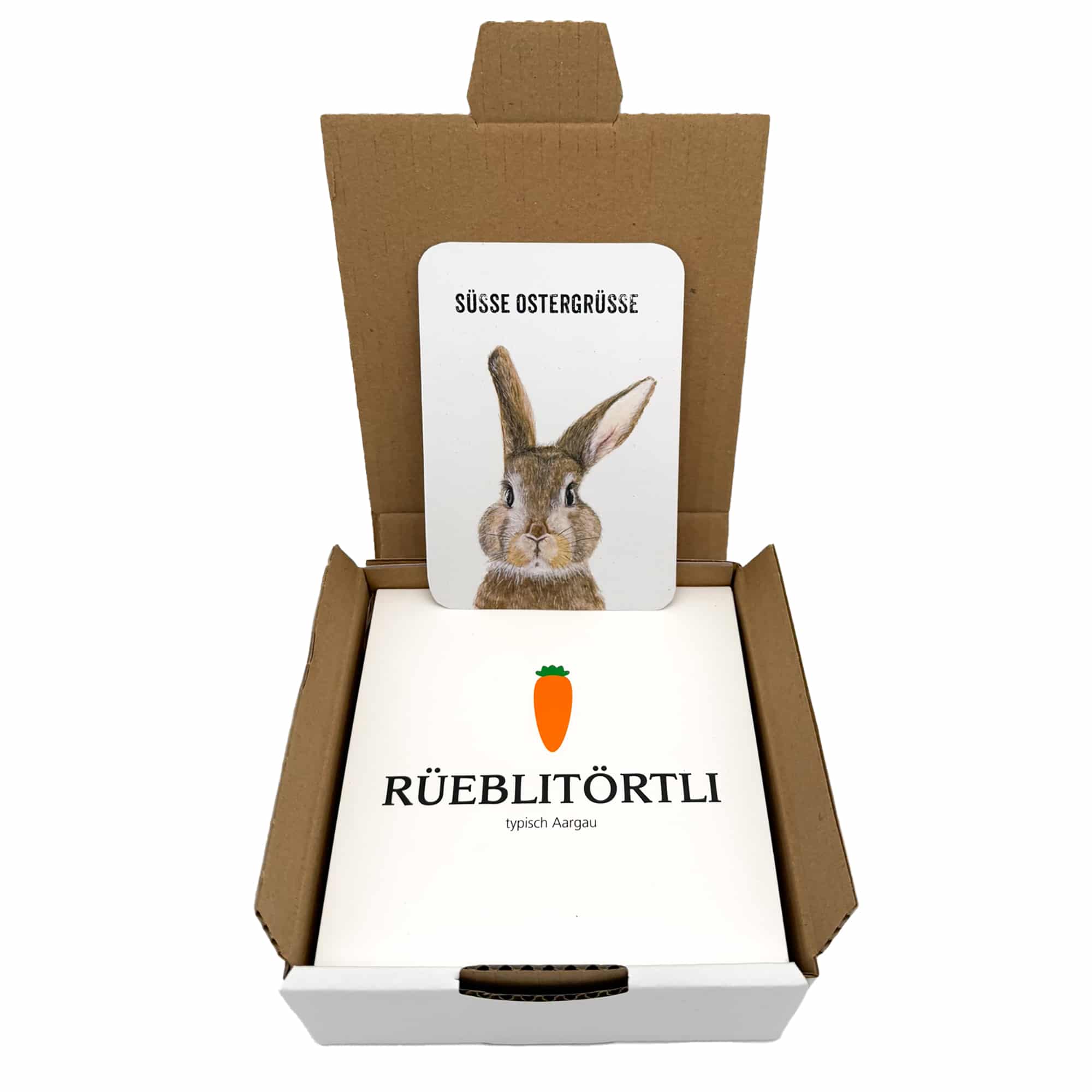 Ein handgefertigtes, feines Rüeblitörtli und eine Karte mit süssen Hasengrüssen. Schreibe einfach deinen Text in das Bemerkungsfeld und dein persönlicher Gruss wird übermittelt.
