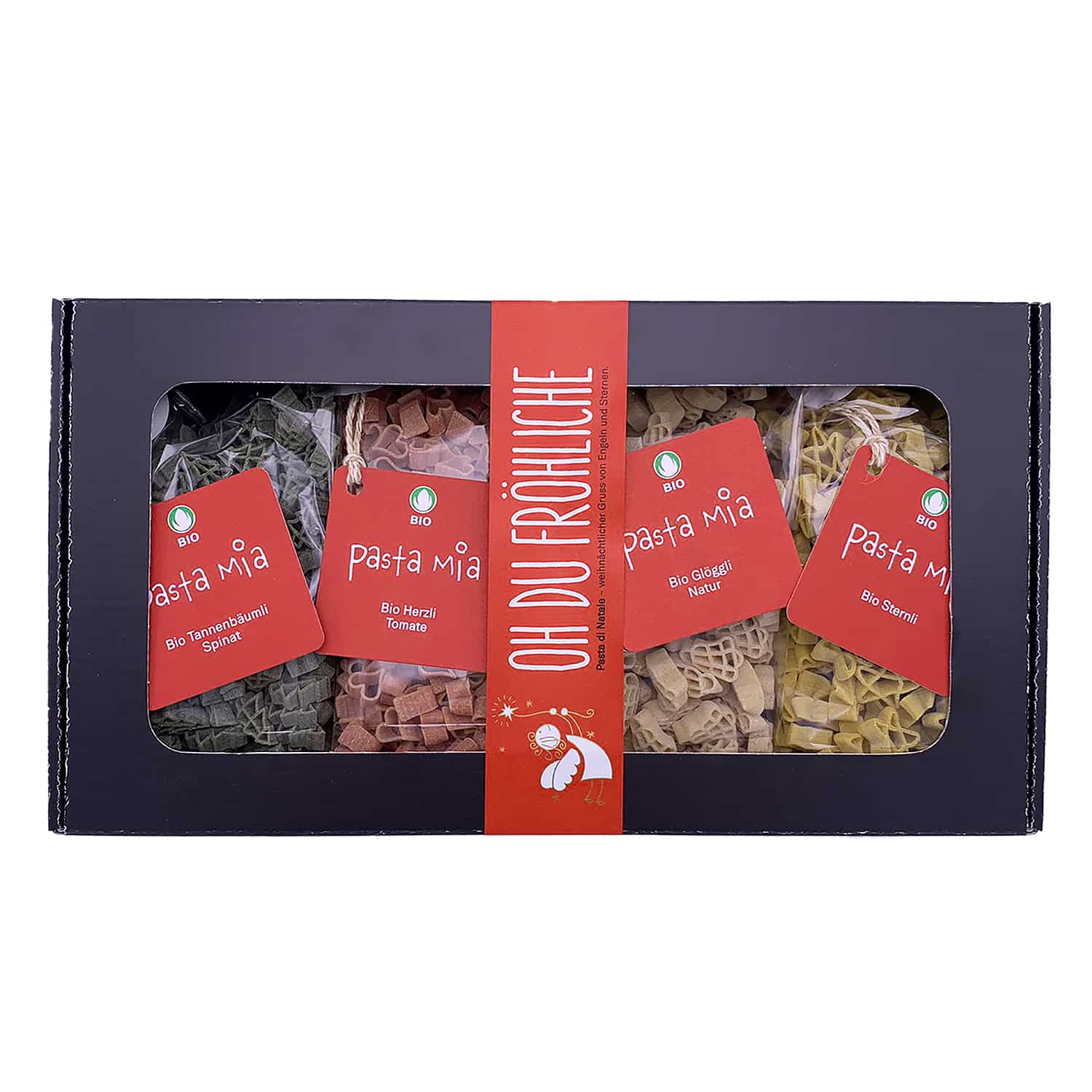 Verschenke bunten Bio Pasta-Genuss in dekorativen Formen: Tannenbäumli , Herzli , Sternli und Glöggli!