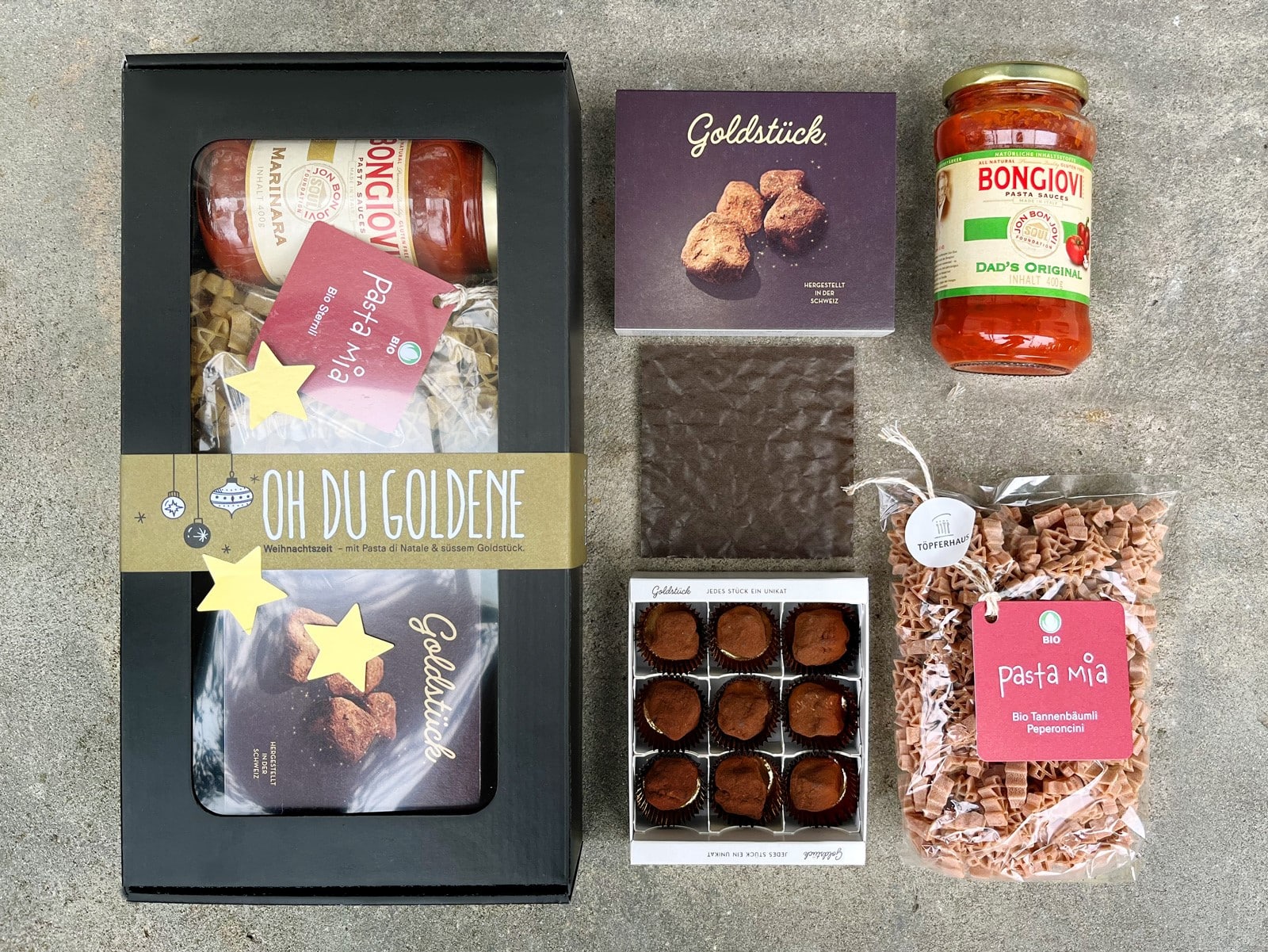 Mit „Oh du Goldene“ verschenkst du puren Genuss: Die Bio Sternli Teigwaren kombiniert mit der leckeren“ Marinara“ Tomaten-Sauce und zum Dessert zartschmelzende Goldstücke.