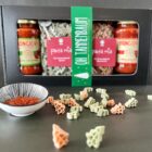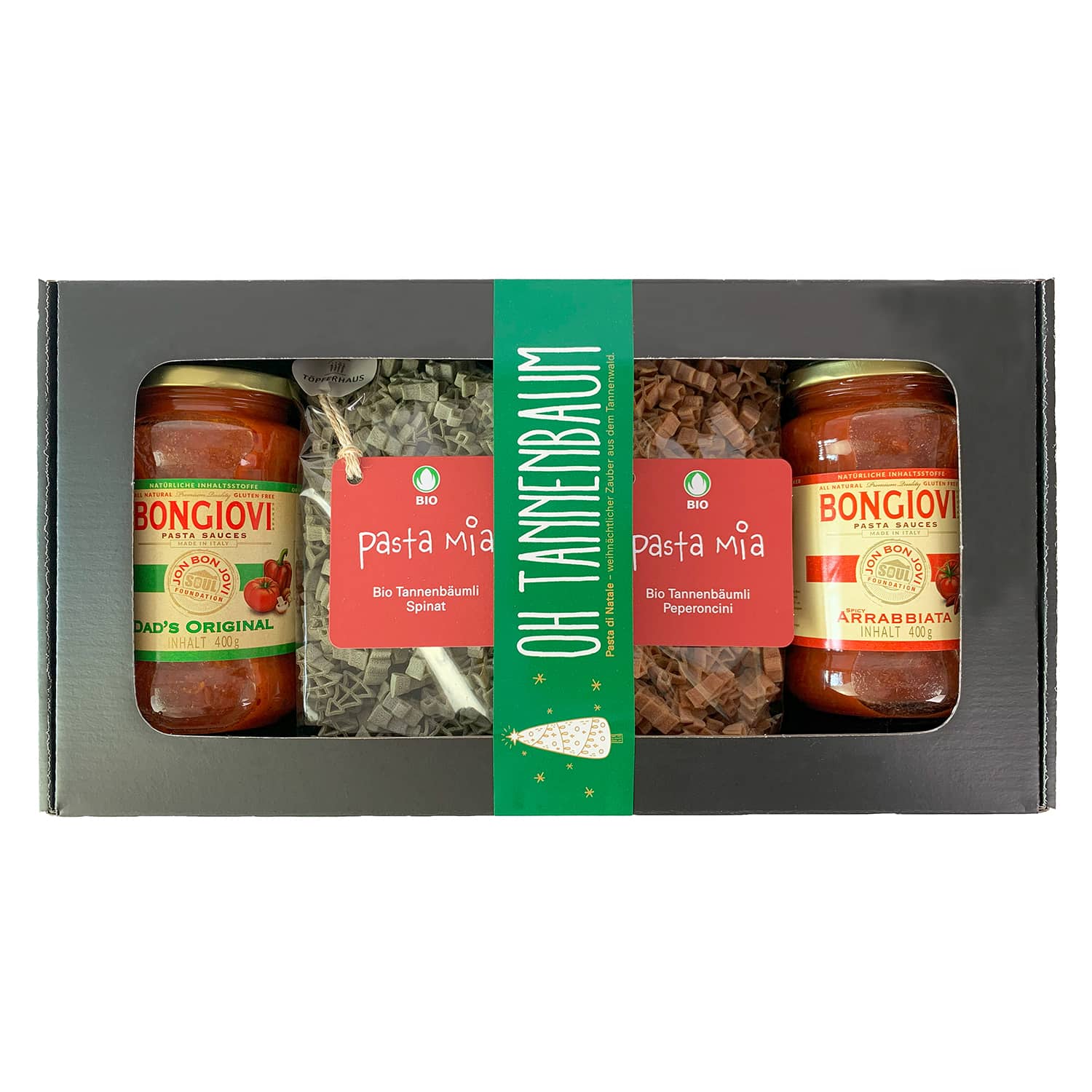 Zweimal weihnachtliche Pasta auf dem Teller! Einmal mild mit Bio Tannenbäumli Spinat und Pasta-Sauce „Dad’s Original“, einmal pikant mit Bio Tannenbäumli Peperoncini, kombiniert mit Arrabiata-Sauce.