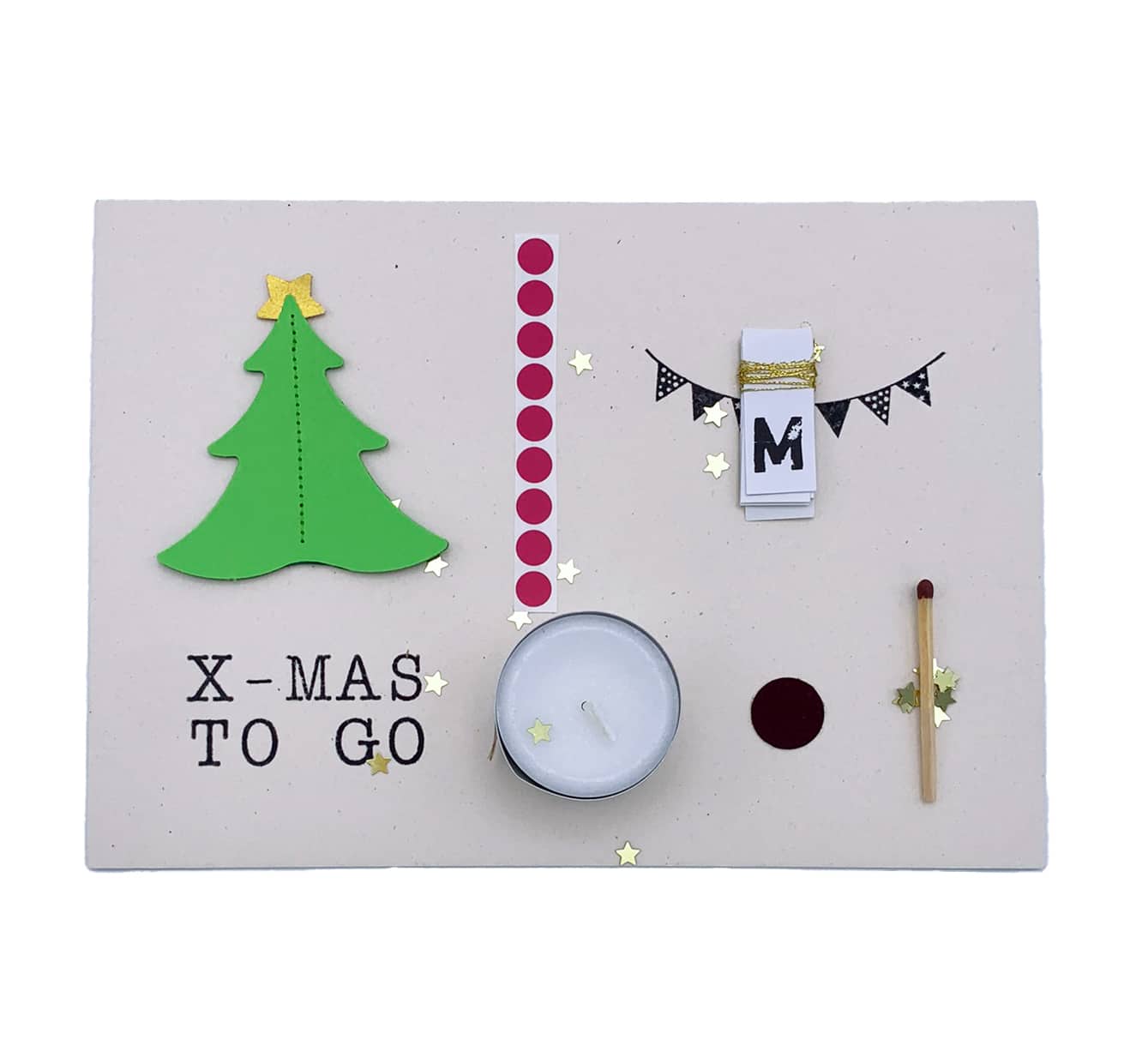 Weihnachten für unterwegs. Schmücke den Baum, häng die Girlande auf und zünde die Kerze an!